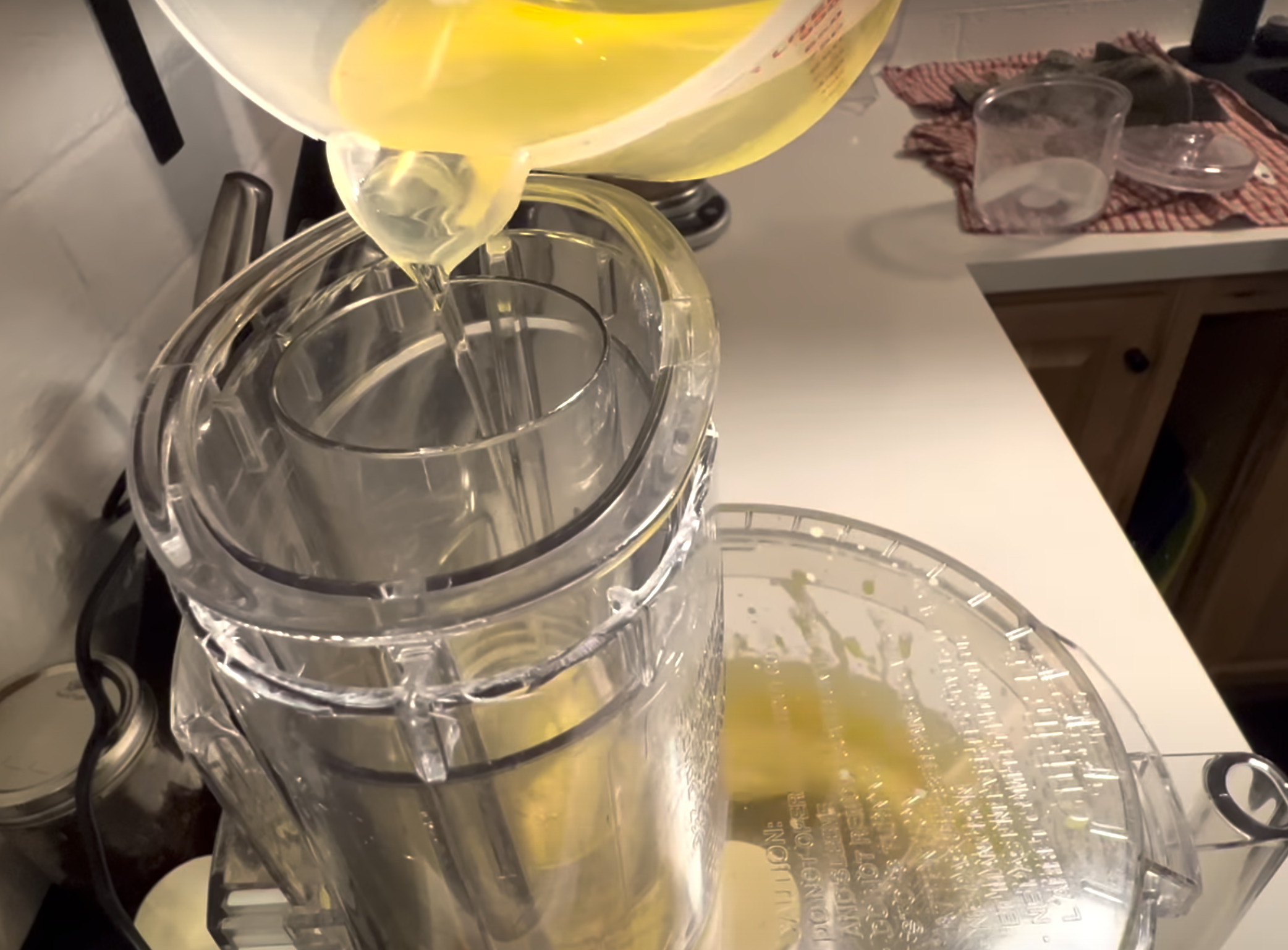 We can do this with a food processor or an immersion blender - the blade will spread the oil out into droplets until the two liquids combine and thicken into the emulsion we know as mayonnaise.