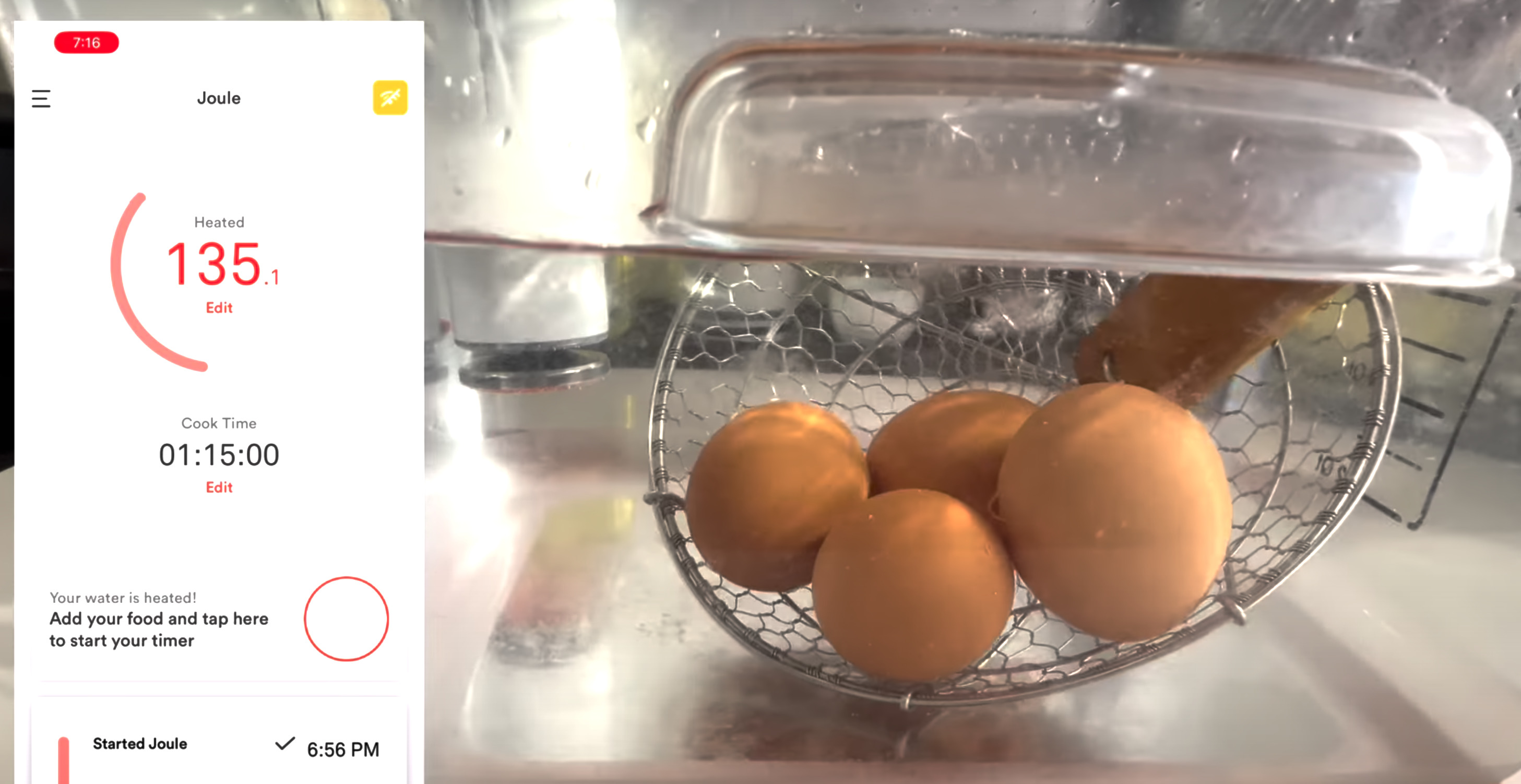 Prep your sous vide with enough water to cover your eggs and bring the temperature up to 135F. Add your eggs and cook for 75 minutes.
