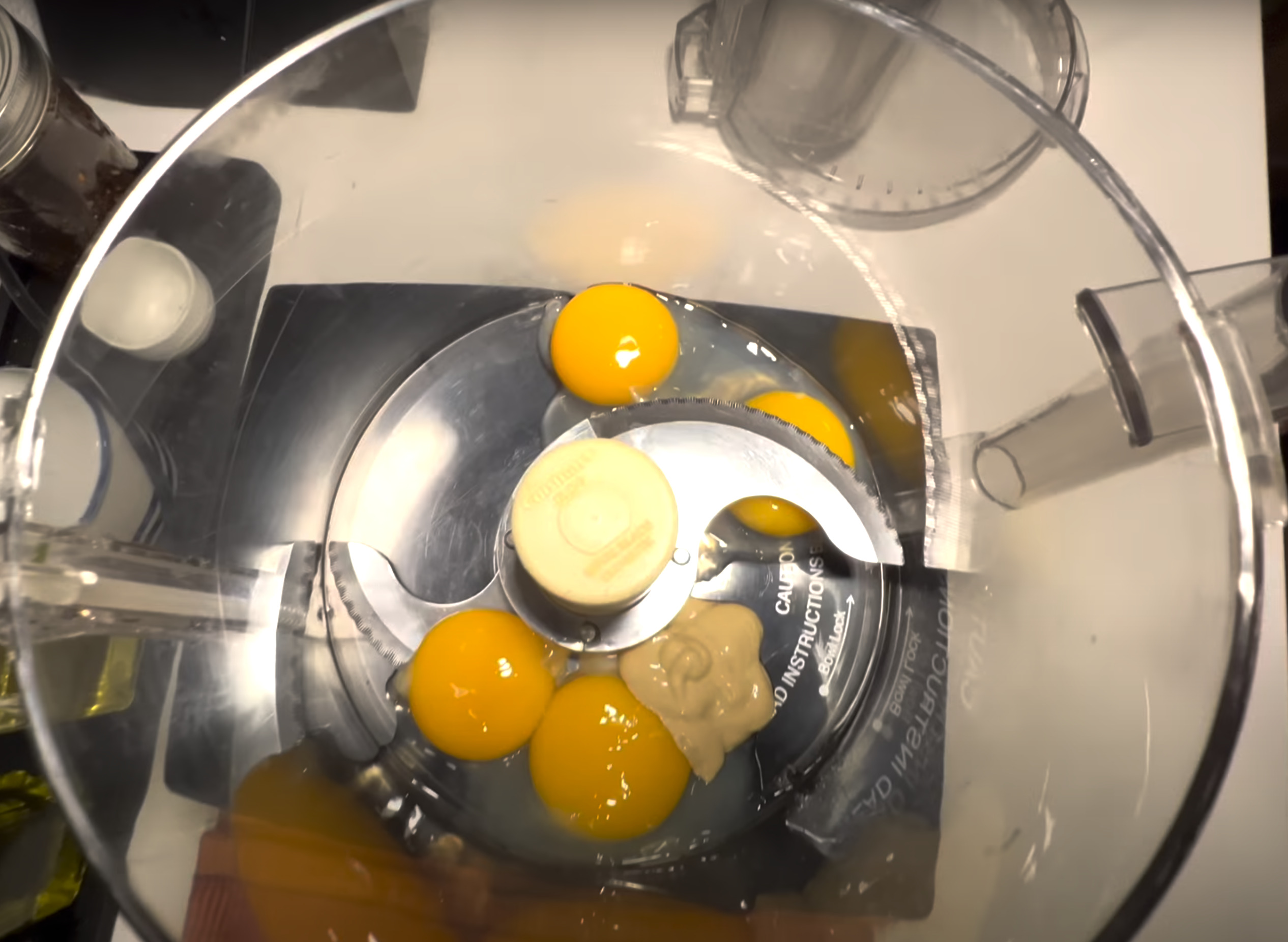 Seperate your egg yolks from the whites and add them to the bowl of a food processor along with dijon mustard.
