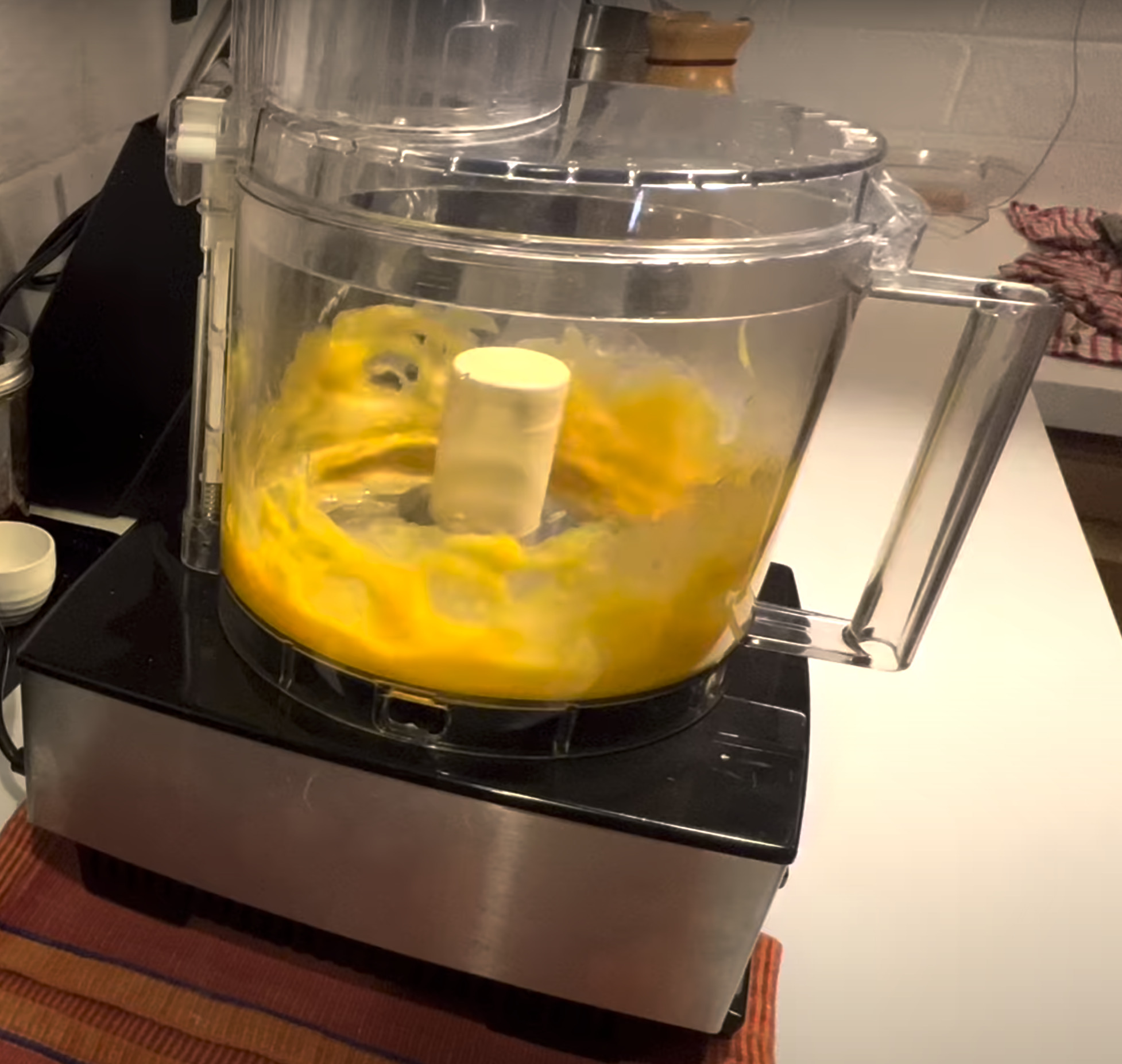 Measure out neutral oil and pour one third of it in a thin but steady stream into the processor while it is on. It’s important to add a small amount of oil at a time so the processor can do the work of evenly dispersing the oil throughout the yolk mixture into tiny beads. Adding to much oil at once can risk an uneven distribution and a broken emulsion.